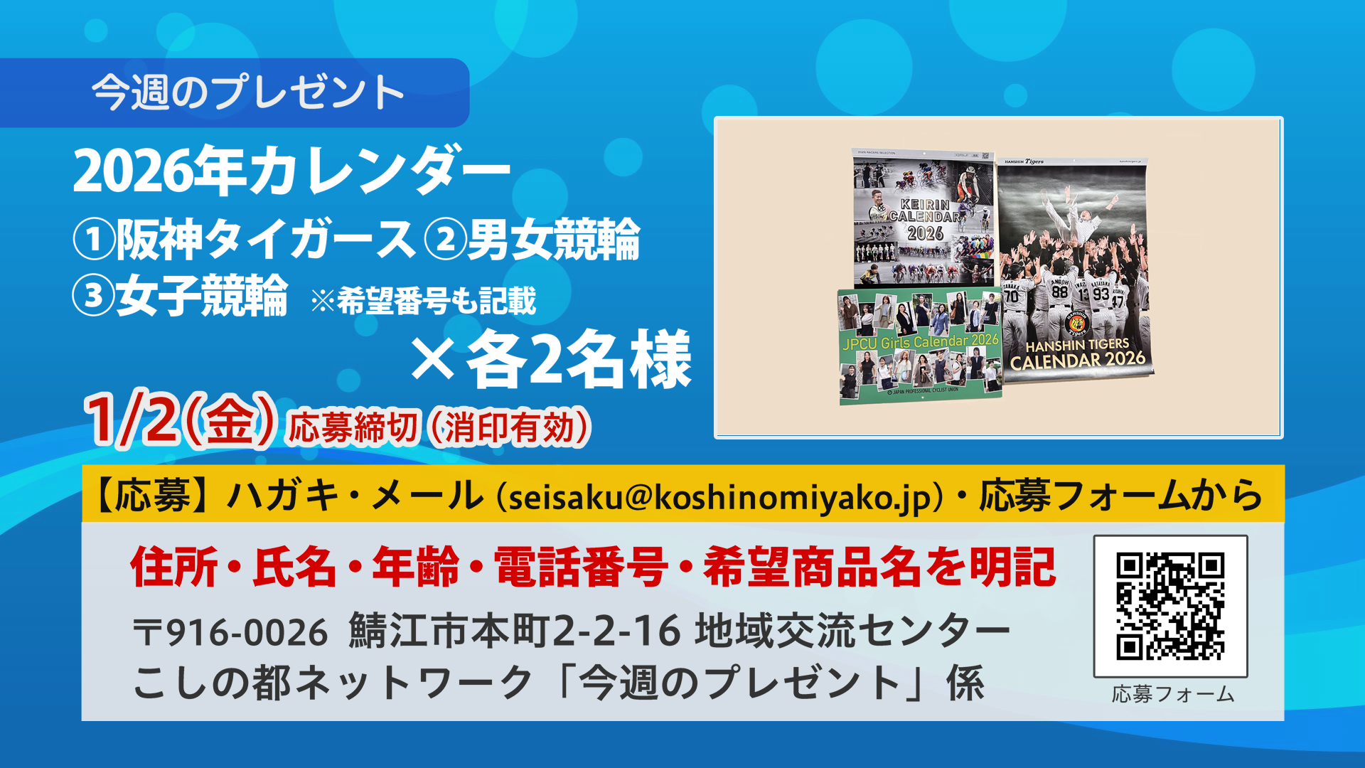 2.2026年カレンダー ①阪神タイガース ②男女競輪 ③女子競輪 ※希望番号も記載 ×各2名様:応募締切:1月2日(金)
