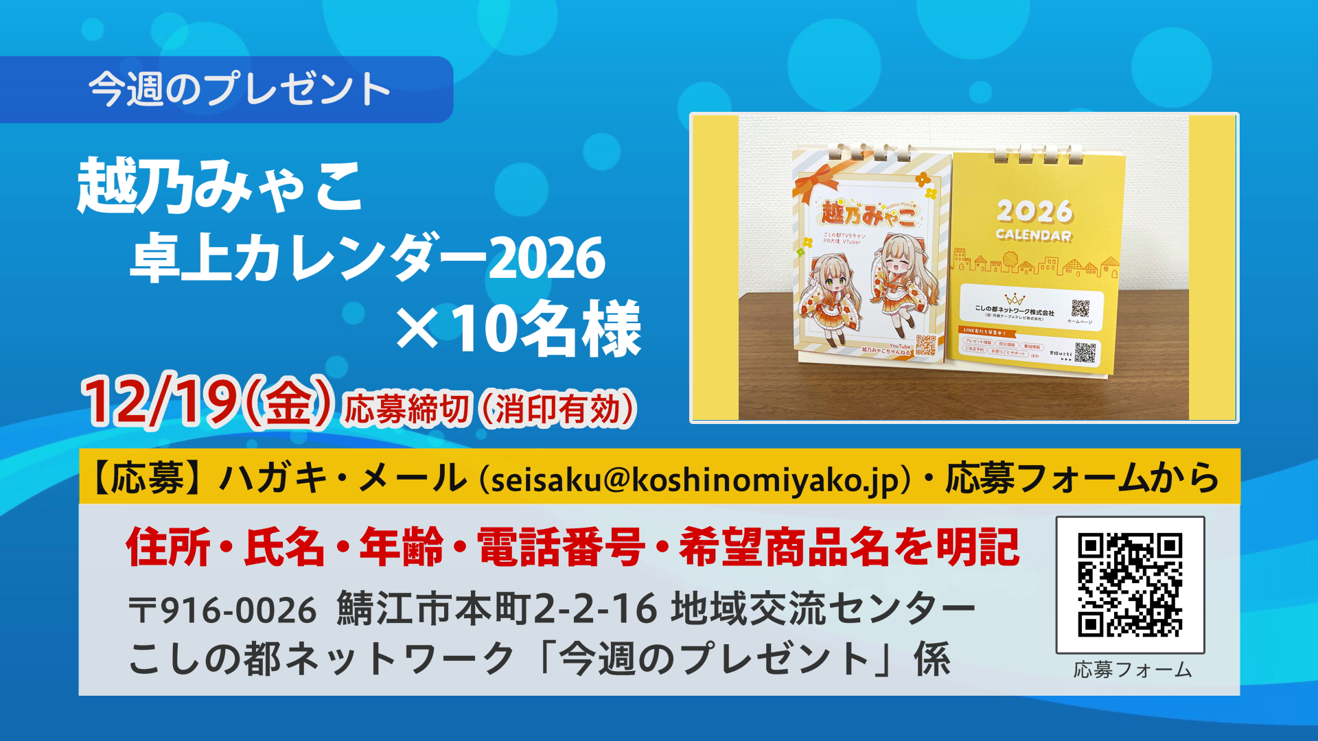 3.越乃みゃこ卓上カレンダー2026×10名様:応募締切:12月19日(金)