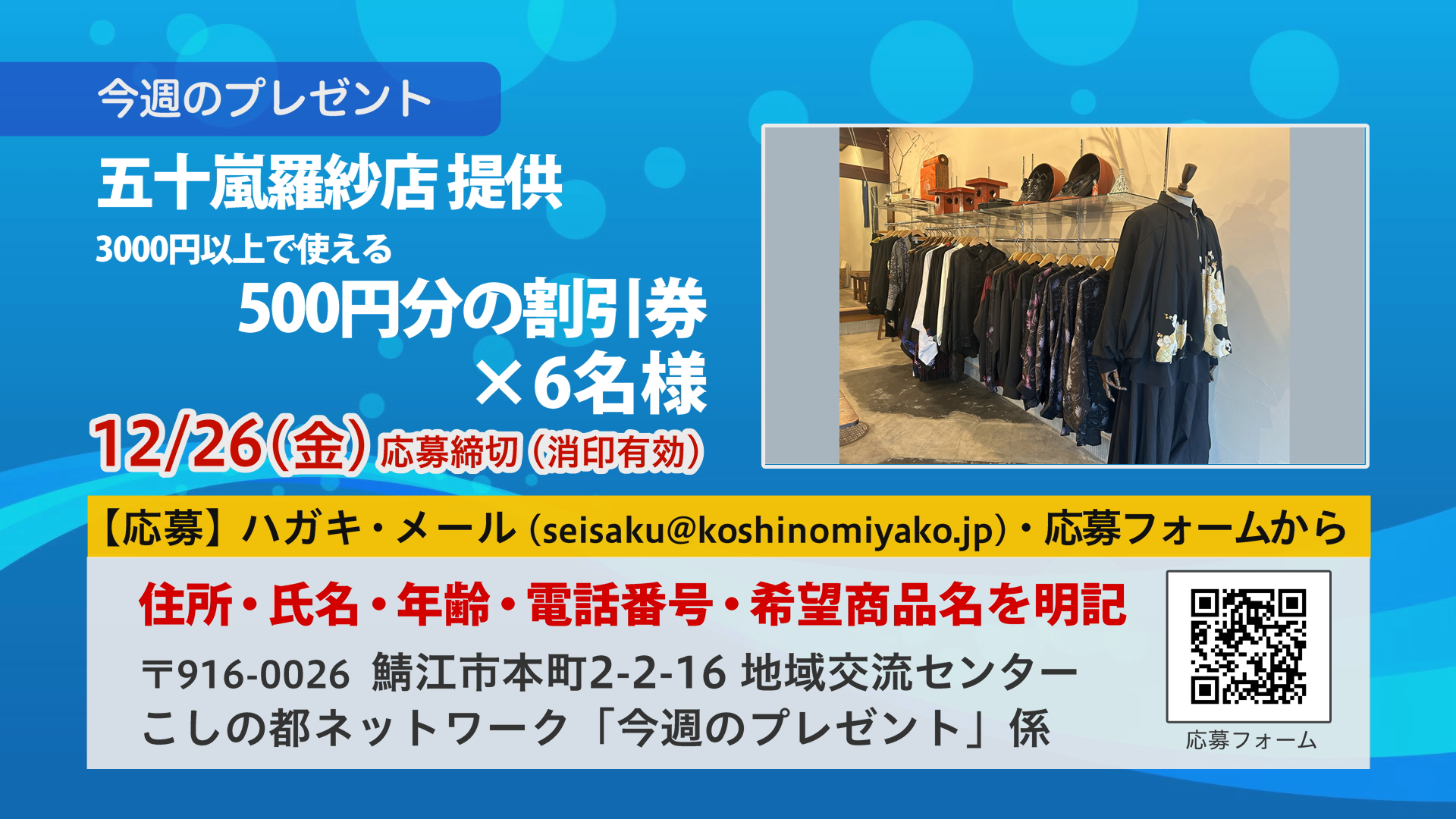1.五十嵐羅紗店提供_3000円以上で使える500円割引券×6名様:応募締切:12月26日(金)