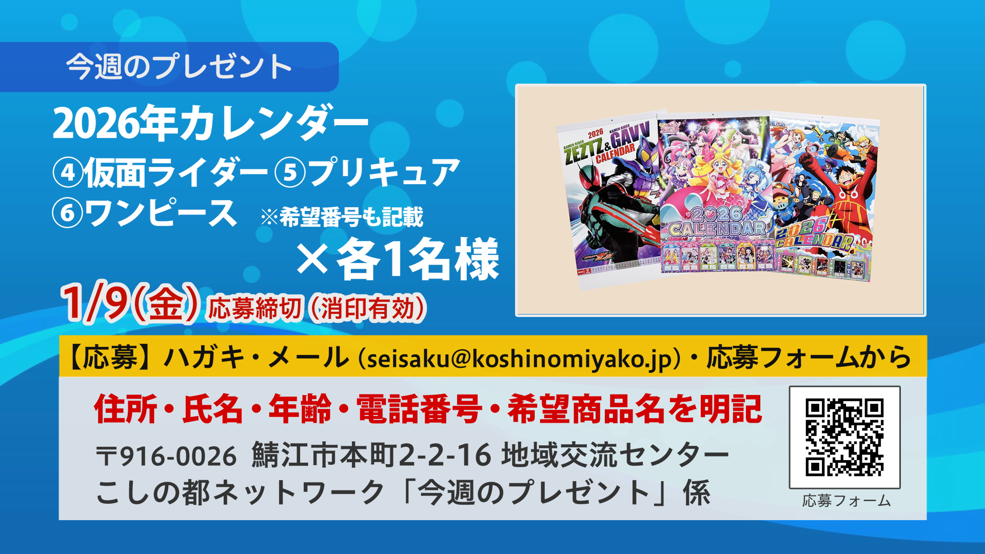 2.2026年カレンダー ④仮面ライダー ⑤プリキュア ⑥ワンピース※希望番号も記載 ×各1名様:応募締切:1月9日(金)