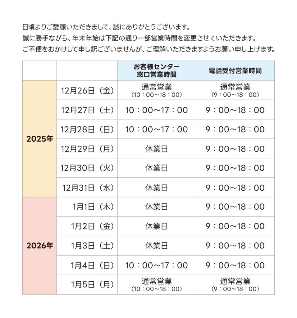 お客様センター 年末年始営業時間のお知らせ