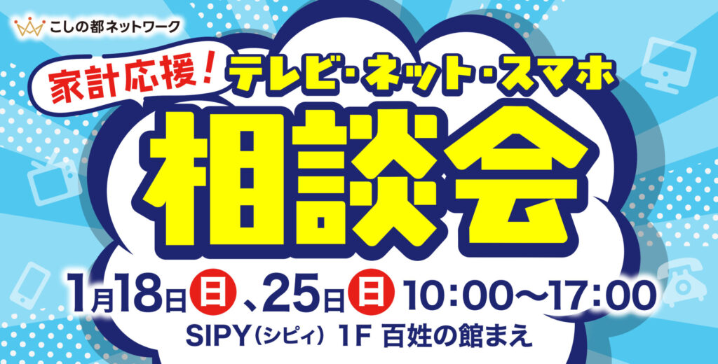 こしの都ネットワークでは、2026年1月18日(日)・25日(日)に越前市のショッピングセンターSIPY(シピィ)で「家計応援!テレビ・ネット・スマホ相談会」を開催します。