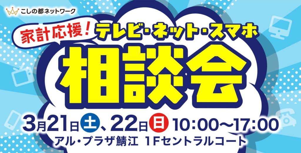 こしの都ネットワークでは、2026年3月21日(土)・22日(日)の2日間、アル・プラザ鯖江 1Fセントラルコートで「家計応援!テレビ・ネット・スマホ相談会」を開催します。
