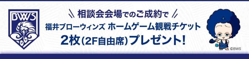 当日限定のご成約特典として、なんとプロバスケットボールチーム「福井ブローウィンズ」のホームゲーム観戦チケット2枚(2F自由席)をプレゼント!